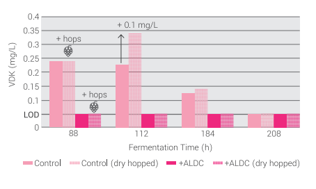 From this, most sour beers are not good candidates for dry hop dosing of ALDC.