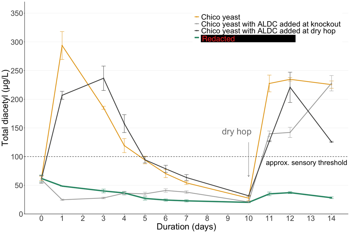 I ask because the knockout addition should have activity that the dry hopping addition would be supplementing - just as a slight correction to Joel's comment, below is our data for a generic dry hopped pale ale that had 3g/hl of ALDC added at knockout. This does show that the dose applied at knockout will still be somewhat effective, so long as the pH does not drop too far below 4.0 prior to that during fermentation: