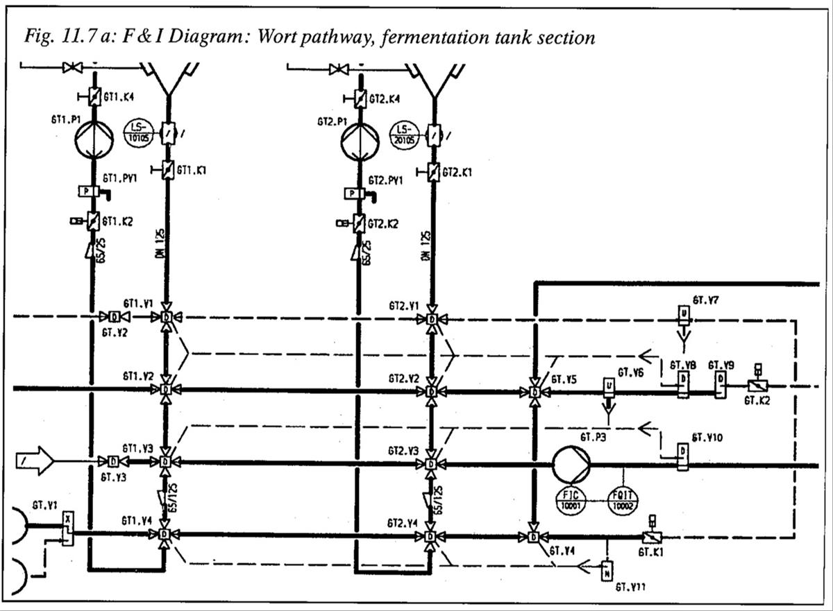 The key is that the CIP supply and return valves for every path are located at the extreme ends of the matrix. You are right in noticing that dead-legs are created during various operations (filling, emptying, yeast/hop removal), depending on the location of the valve used for the operation. However, it is most important to eliminate dead-legs during CIP. As long as you can clean and sanitize through the entire row or column once the operation is finished, then you can ensure the whole pipe is clean. If you see any dead-legs in a path during a cleaning cycle in a matrix design, that is definitely cause for concern. This is something we had a lot of similar questions about when we started using valve matrices at Deschutes Brewery, and it look some discussion and careful path tracing to make us comfortable. Post matrix installation, years of clean lab results added to that level of comfort!