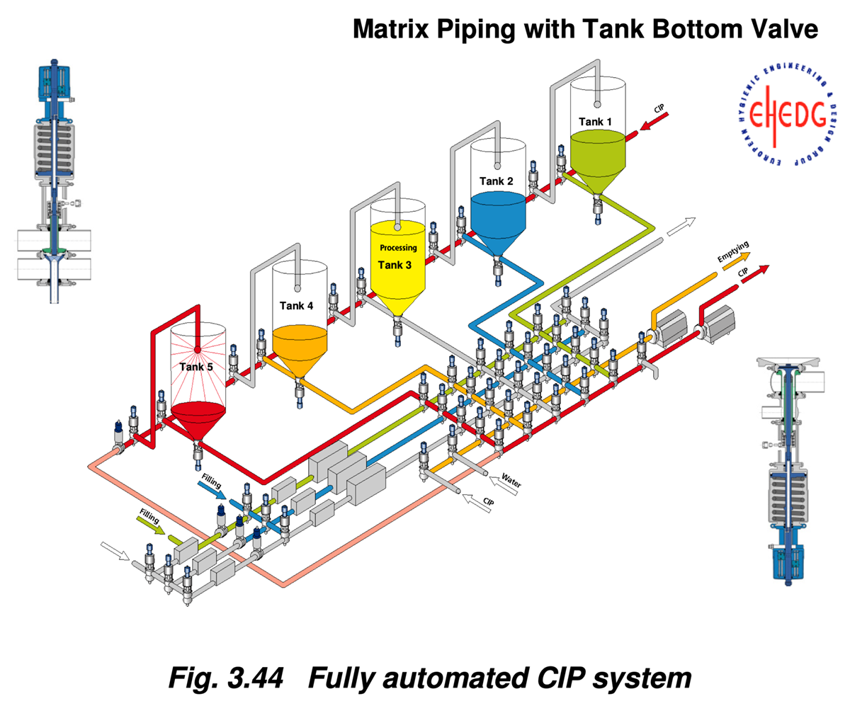 • Taking care to "design out" any issues, most importantly by having all CIP operations supply or return from the extremeties of the matrix and be appropriately interconnected. Presumably a good design would be well-informed by the processes it's designed to handle and weigh the importance of minimizing losses from each.