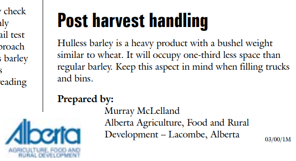 IN your talk slides you note a couple of times that hull-less barley occupies about 1/3 less storage space. Do you or someone else have this basic truth published somewhere?