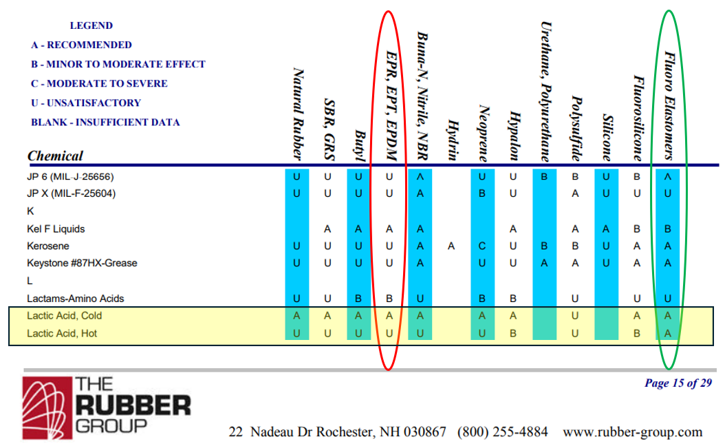 - Is this due to EDPM not holding up to the hot Lactic? or do we need a different "cure" or type of EDPM? Is the grey EPDM better in this situation?