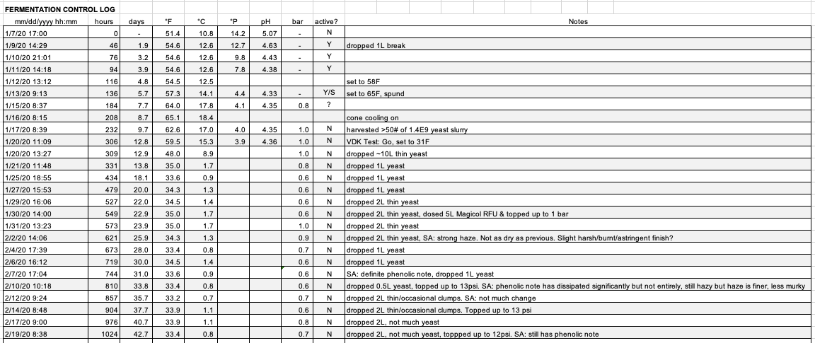 - I am suspicious of the isinglass addition (even though this was a routine dosage), only because I first noticed the POF 3 days after that addition, which took place well into cold maturation. That said, while I definitely tasted throughout the 1st ~13 days when pulling samples (and absolutely tasted during the VDK test @ 12.8 days) I don't have a record of any sensory between then and when I first noticed the POF @ 25.9 days. (BTW I have now changed my logs/process to indicate whether or not I tasted at each data entry to aid future troubleshooting.)
